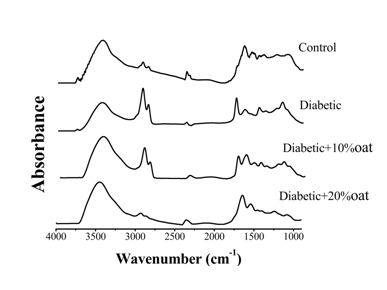 The absorption band 1710 cm-1 of the spectra which ascribed to C=O stretching vibrations of carboxylic acid of the amino acid was shifted to higher wave number and there were a significant increase in the diabetic group and diabetic treated with 10% oat group. But in diabetic treated with 20% oat group, there was no significant change in the wave number of C=O. Also the significant changes in bandwidth in diabetic group and those treated with 10% oat were disappeared in the group treated with 20% oat.