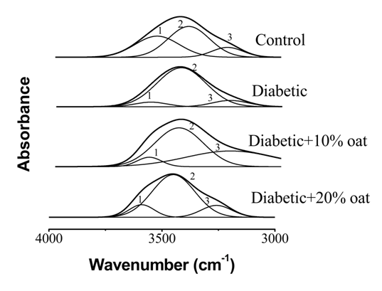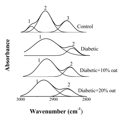After treatment with oat, the strOH and strOHasym mode bands were mimicking the control with changes of bandwidth only as showed in table (1). But StrOH sym is very sensitive to diabetic even after oat administration.