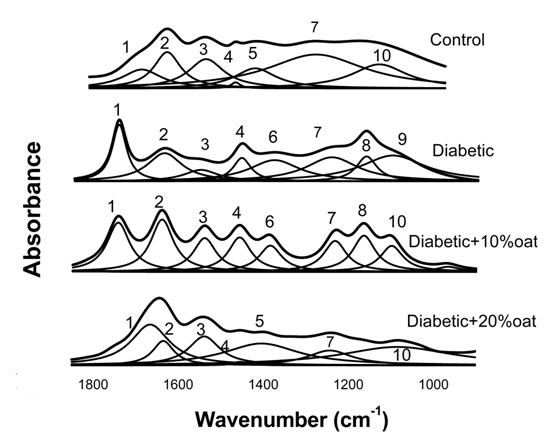 Fig. 4 indicates the vibrational frequency range 1800-1000 cm-1 corresponds to the fingerprint region that presents the lipid and protein parts of all samples [28]. The control pattern was characterized by seven bands and the curve enhancement procedure also confirms the presence of these bands that were centered at 1710±1, 1643±1, 1539±1, 1460±2, 1408±1, 1245±1 and 1086±4 cm-1 that correspond to ester c=o (labeled as 1), amide I (labeled as 2), amide II (labeled as 3), CH2 bending (labeled as 4), symCOO (labeled as 5), asymPO2, (labeled as 7) and symPO2 (labeled as 10) respectively [24]. Table 3 indicated the changes in band frequency and width associated with diabetic and treatment with oat.