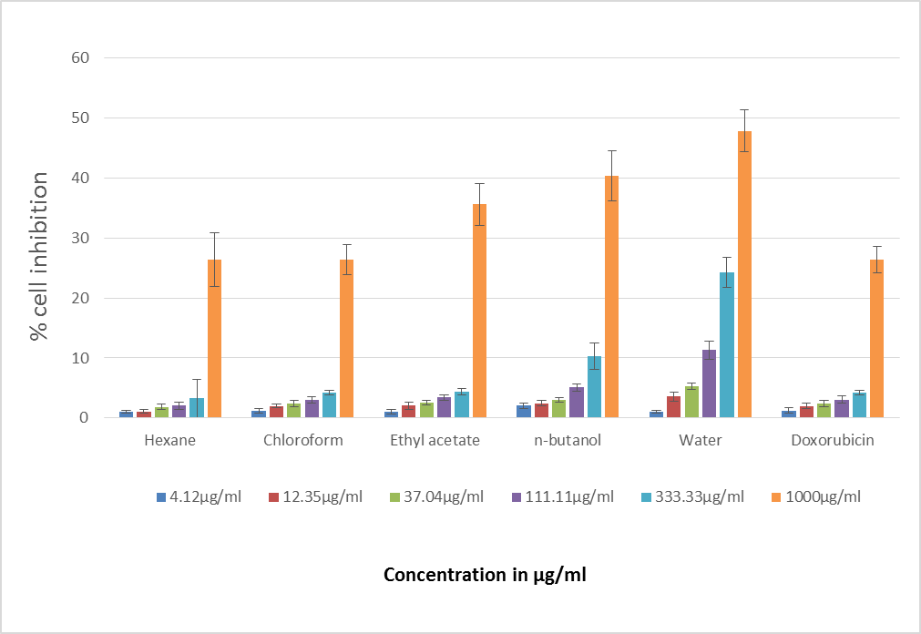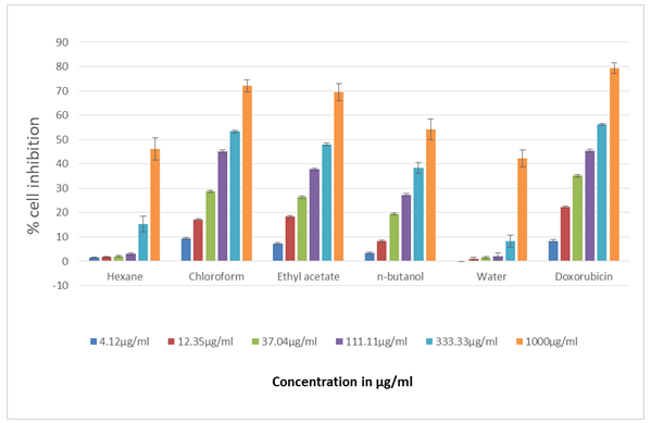 Table 1: It shows IC50 value of doxorubicin and five different extracts of S. racemosa against Hep3B cell line