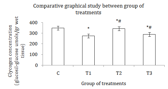 Fig. 1 represented the mean values±standard error (mean±SE) of liver glycogen concentration. Dispersion of measured values around each mean varied from 275.56 to 347.78. Treatment with Cd (T1 group) led to lower liver glycogen concentrations than other group of treatments. That data also suggests the highest liver glycogen concentration is on C group and the lowest was the T1 group. Statistical analysis test results shows that all groups of treatment significantly (p<0.05) reduce liver glycogen concentration compare to control. Liver glycogen concentration was significantly higher in T2 group and lower in T3 group in comparison with the T1 group. The data from fig. 1 suggest that T2 group more effective to maintain the liver glycogen concentration than the T3 group.