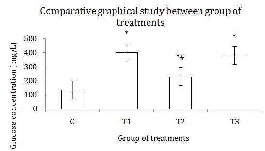 Fig. 2 represented the mean values±standard error (mean±SEM) of liver glucose concentration. Dispersion of measured values around each mean varied from 137.00 to 399.45. All groups of treatment (T1, T2, and T3) showed a higher glucose concentration compare to control. Also, the data from fig. 2 shows that treatment with Cd (T1) can increase the glucose concentration compare to control, while treatments with bark (T2) and leaves (T3) of gemor can decrease the glucose concentration compare to T1 group. Statistical analysis test results show treatment with Cd, bark and leaves of gemor led to a significant increase of liver glucose levels in comparison with the negative control group. Treatment with a bark of gemor led to significant decrease of the glucose concentration compare with Cd treatment group, and treatment with leaves of gemor also decreases the glucose concentration but non-statistically significant.