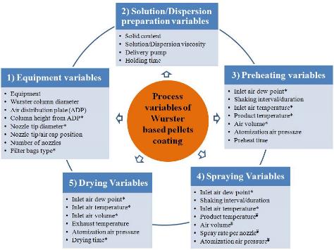 There are five sets of process variables involved in Wurster based pellets coating process equipment variables, solution/dispersion preparation variables, preheating variables, spraying variables and drying variables. The variables come under each set provided in fig. 1.