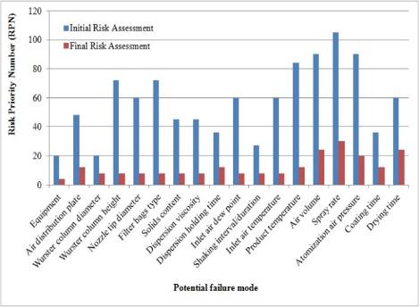The FMEA is the best risk management tool can used for Wurster based pellet coating process to categories the risk of process variables. The risk of each failure is prioritized based on the risk priority number (RPN). RPN is a decision factor based on three ratings: Severity (S), Occurrence (O) and Detection (D). These ratings are scaled with numbers between 1 and 10 [19]. Risk Priority Number, which is the product of the severity, occurrence and detection ratings is calculated as RPN = S x O x D. The RPN must be calculated for each cause of failure. RPN shows the relative likelihood of a failure mode, in that the higher number, the higher the failure mode. From RPN, a critical summary can be drawn up to highlight the areas where the action is mostly needed [20]. Risk priority numbers (RPNs) were calculated as the product of occurrence, severity and detectability scores. Failure mode scores could range from 1 to 1000 [21]. We ranked S, O and D of 1-3 as best-case value, 4-7 as moderate-case value and 8-10 as worst-case value, and then a maximum RPN of 1000 and a minimum RPN of 1 are possible.