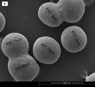 Fig. 7: SEM images of enteric coated pellets of-a) optimized process parameters of trial V1 b) scale up batch (PTZ40-001).