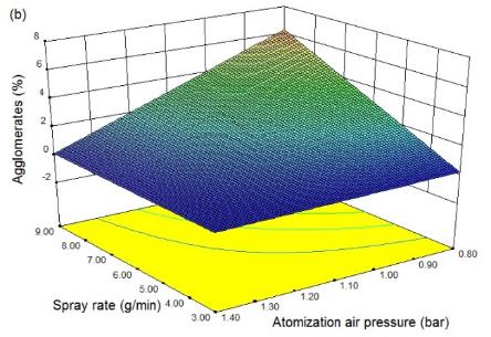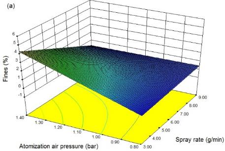 The correlation coefficients (R2) for all three responses indicated good fits to the raw data. However, lower correlation coefficients were obtained for fines (0.883) and assay (0.780). This might be due to some spray dried coating material wet through filter bag and not considered in the calculation of percentage fines. For assay, results were observed in the range of 96.8-100.1% which very narrow range. Small change in decimal results made big error. Hence, value of correlation coefficients found less than 0.9.