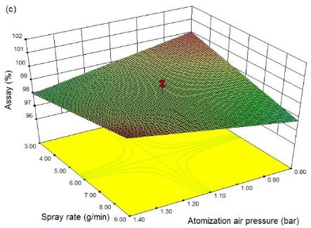 Assay was significantly influenced by the linear models of spray rate (X2). Fig. 4c portray the three-dimensional surface plot indicated that when X2 increased from-1 level to+1 level, Y3 were found to increased linearly could be due decreased loss of coating solution due to spray drying.