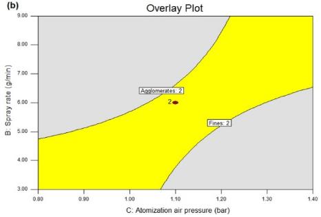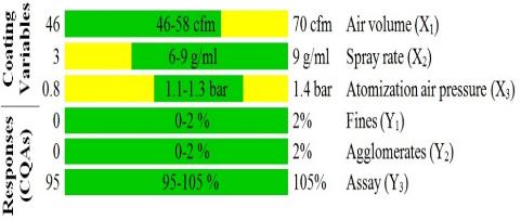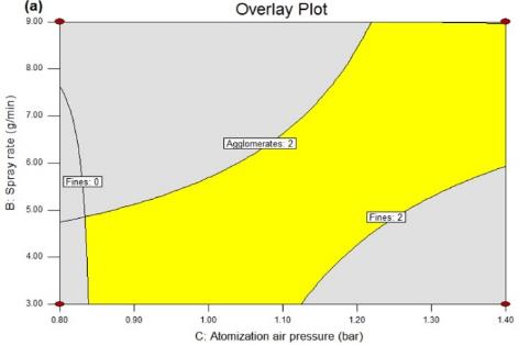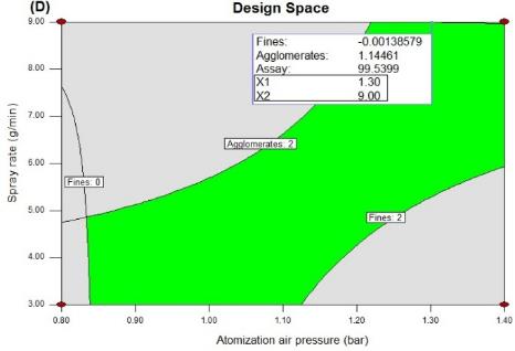 The DS was established which was delineated in the green region in fig. 5d, the range of the process variable was the air volume of 46-58 CFM, spray rate of 6-9 g/min and atomization air pressure of 1.1-1.3 bar of the point inside the green region.