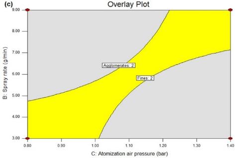 The multidimensional combination and interaction of independent variables and process parameters that have been demonstrated to provide assurance of quality is termed as the design space [25]. DS could be determined from the common region of successful operating ranges for the two responses. Experimental validation of DoE trials was undertaken by fabrication of optimized process variables. For optimized process variables, levels of factors which provided fines (Y1) in 0-2% range, agglomerates (Y2) in 0-2% range and assay in 95-105% range were screened. Fig. 5a, b and c shows the overlay plot for air volume 46 CFM, 58 CFM and 70 CFM respectively kept constant. Fig. 5d showed the overlay plot showing the optimized parameters suggested by DoE software to obtain the desired responses for process variables.
