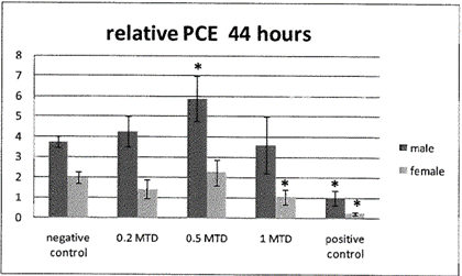 Blood was obtained from the tail vein after its incision and collected in the Li-heparin tubes. Blood cells were fixed immediately in ultra cold (-80 °C) methanol and stored at-80°C. After 16 hours of fixation, it is washed with Hank’s balanced salt solution, centrifuged at 600 x g for 5 minutes and supernatant discarded. The cell populations were discriminated using specific antibodies against anti-mouse CD71-FTC (expressed at surface of immature erythrocytes) and hamster anti-mouse CD61-RPE (expressed at surface of platelets) and DNA content of micronuclei was determined by the use of DNA specific stain (PI). Evaluation of all samples was performed using a flow cytometer (FACScan, BD Biosciences). Antibodies were labeled with Fluorescein-isothiocynate (FITC) and Phycoerythrin (PE) and measured for fluorescent intensity. Ten thousand (10,000) immature erythrocytes per animal were scored for incidence of micronucleated polychromatic (immature) erythrocyte. The results were expressed as relative proportion of polychromatic erythrocytes among total erythrocytes (relative PCE) by calculating ratio polychromatic erythrocytes (PCE) to normochromatic erythrocytes (NCE).