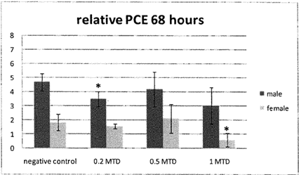 The in vitro Ames test, which was conducted using strains of Salmonella typhimurium, is a widely used bacterial assay for the identification of chemicals that can produce gene mutations, and it shows a high predictive value with rodent carcinogenicity tests [10]. The in vivo mammalian micronucleus test is used for the detection of damage induced by the test item to the chromosomes or the mitotic apparatus of erythroblasts by analysis of erythrocytes as sampled in the bone marrow of animals, usually rodents. The conducted study involves measurement of micronucleated polychromatic (immature) erythrocytes in peripheral blood, which is equally accepted since the spleen of mice is unable to remove micronucleated erythrocytes.