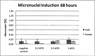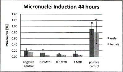 Specific-pathogen-free male and female NMRI mice (n = 50), aged 6–12 weeks were used in this study. The animals were obtained from Charles River, 97633 Sulzfeld, Germany. The research was conducted in accordance with the Principle and Guide to Ethical Use of Laboratory Animals, MOH and OECD TG 474 Guidelines for Mammalian Erythrocyte Micronucleus Test (OECD, 1997) at a GLP complaint facility (BSL Bioservice Scientific Laboratories GmbH). The animals were housed in IVC cage (poly sulphone; Type II L; five mice of identical sex per cage) bedded with Altromin saw fiber. The animals were provided with commercially available rodent feed (Altromin 1324 maintenance diet for rats and mice) and water ad libitum. The animals were maintained under controlled environmental conditions of 12 hours light/dark period, 22±3 °C room temperature and humidity at 55±10 %.