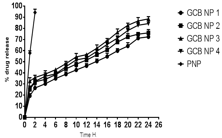 The in vitro release of GCB loaded MPEG-PCL NPs in buffered solution pH 7.4 was shown in fig. 8. A typical two-phase-release was observed, i.e., burst release was observed from all the four batches of GCB loaded MPEG-PCL NPs in 1 hr, followed by a relatively slower and sustained release was observed up to 24 h. The GCBNP 3 shows the maximum drug release by the end of the 24th hour.