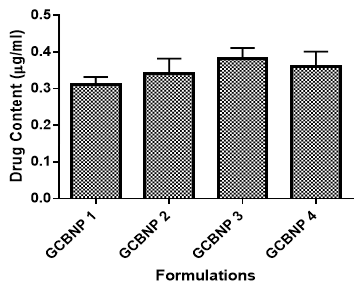 The prepared GCB loaded MPEG-PCL nanoformulations were examined for drug content and maximum amount drug was loaded in the GCB NP 3(0.381 µg/ml). The drug content of all the batches is represented in the fig. 6.