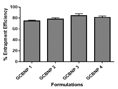 GCB loaded MPEG-PCL nanoformulations were estimated for entrapment efficienciency, and the results are shown in the fig.7. Among the prepared batches of the nanoparticles, maximum entrapment of drug was observed in GCBNP 3 (84.64%).