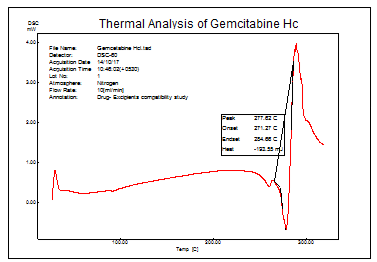 Differential scanning calorimetric (DSC) analysis were carried out by using Shimadzu DSC-60, to determine the interaction between the GCB and other excipients used. Samples were analyzed in a temperature range of 0 °C-400 °C at a heating rate of 5 °C/min under nitrogen atmosphere. The samples were prepared by pressing them in a DSC aluminium pans and subjected to analysis.