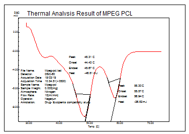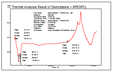 DSC is an important technique to analyze the polymer-drug interactions and also it has previously been used to show the dispersity of the molecules [20]. Thermal analysis was used to evaluate the changes in thermodynamic properties that occur when the material supplied heat energy. Changes that can be observed in the process of melting, desolvation, recrystallization and solid phase transformations indicated by endothermic or exothermic peaks at thermogram. DSC thermogram showed solid endothermic peak of GCB at 277.62 °C. The polymer MPEG-PCL indicated endothermic peaks at 48.31 °C and 58.30 °C, respectively. The endothermic peaks of GCB and MPEG-PCL observed at similar temperature ranges, which eliminate the possibility of any physical interaction. The DSC thermo grams of GCB and MPEG-PCL and their combinations are shown in fig. 1 A, B, C.