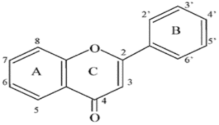 Fig. 2: The skeleton structure of the flavones (a class of flavonoids), with rings named and positions numbered