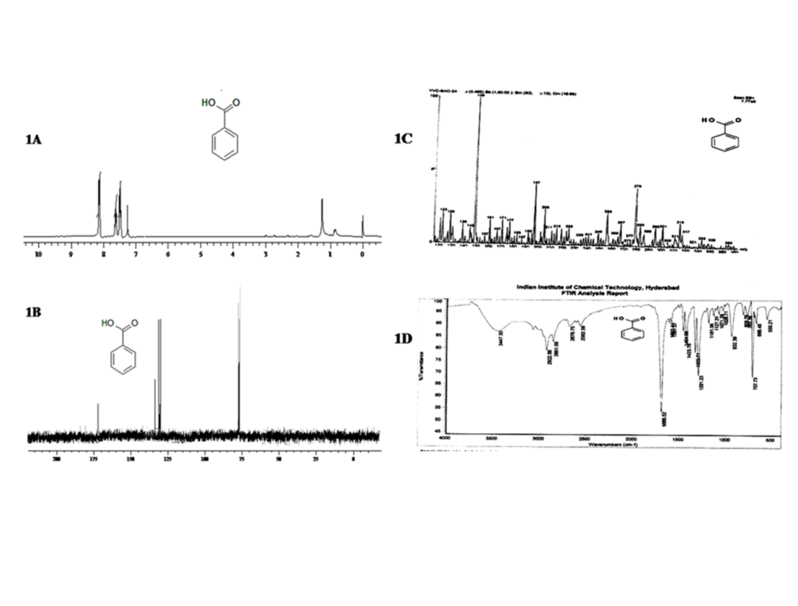 Compound (1) was obtained as a colourless crystalline solid, freely soluble in ethanol and partially in benzene, acetone and water. The 1H-NMR spectrum of the compound showed signals at d6.89 (m, 2H); 6.37 (m, 1H) and 6.22 (m, 2H) (fig. 1A), while 13C exhibited 5 signals at d 172.5; 133.78; 130.19 (2C); 129.32 and 128.45 (2C) (fig. 1B). EIMS analysis of the compound gave a molecular ion m/z at 145 [M+Na]+ (fig. 1C) The IR spectrum displayed absorption band at V max 1695 cm-1suggested the presence of functional groups like carboxyl groups (fig. 1D). Based on the above spectral data, bioactive compound 1 was identified as Benzoic acid (fig. 2) with the molecular formula of C7H6O2.