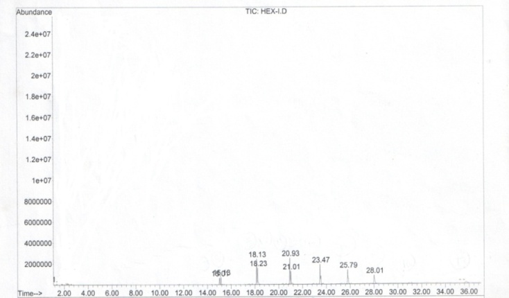 The components of the partially purified fraction (PPF) (2) were analysed on Agilent GC-MS system (GC: 5890 series II; MSD 5972). The fused silica HP-5 capillary column (30 m x 0.25 mm, ID, film thickness of 0.25 µm) was directly coupled to the MS. The carrier gas was helium with a flow rate of 1.2 ml min-1. Oven temperature was programmed (50°C min-1, then 50-280°C at a rate of 5°C min-1) and subsequently, held isothermally for 20 min. The temperature of the injector port was maintained at 250 °C and that of the detector at 280 °C [15]. The peaks of components in gas chromatography were subjected to mass spectral analysis. The spectra were analysed from the available library data; NIST MS search (ver. 2.0).(Included with NIST’02 mass spectral library, Agilent p/n G1033A).