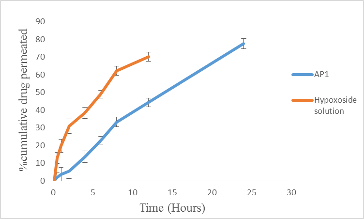 Fig. 3: It shows comparative release profile of optimized ethosomal formulation (AP1) and hydroethanolic solution of hypoxoside (mean±SD, n = 3)