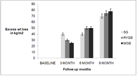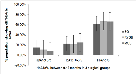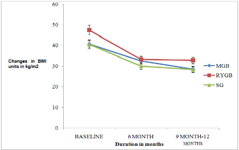 Methods: A retrospective analysis of prospectively collected data base of three bariatric metabolic surgery groups were screened from the year 2010-2014 at the study centre for patients satisfying the inclusion criteria. Three follow up data at an interval of three months and a base line value for all the three groups were collected . Outcome measurethe percentage of patients achieved diabetes remission according to American Diabetes Association Criteria (ADA)/International Diabetic Federation (IDF) criteria i.e. Glycosylated haemoglobin (HbA1c)<6 % or<6.5 % without active pharmacological therapy at least I year post surgically and percentage patients lost>60% excess body weight . Secondary outcome includes the percentage reduction in cardiovascular risk factors, changes in medication associated with diabetes and cardiovascular diseases and immediate and later complications of the three different procedures of surgery . All calculations were performed using SPSS Version 18 statistical software. Descriptive statistics included are calculation of mean and standard deviation. Chi–square test and two factor ANOVA for comparison of means between groups under study.