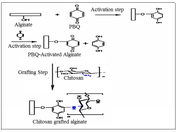 The polyelectrolyte complex of chitosan grafted alginate hydrogel was prepared as following: Firstly alginate was activated using р-benzoquinone (PBQ) [23], by dissolving sodium alginate (low viscosity) in distilled water under mechanical stirring with continuous heating the solution until become completely clear to acquire finally 4% (w/v) concentration. The alginate solution was then mixed with (PBQ) solution (0.08M pH 10) and kept for 2h at 45oC to have the final concentration 2% (w/v) alginate and 0.04 M (PBQ). The mixture was precipitated, washed many times using methyl alcohol to remove the excess of PBQ and left to dry at room temperature. The alginate-PBQ was dissolved again with the same concentration (2%w/v). Chitosan solution (prepared by dissolving chitosan in 0.5% acetic acid) was added to the alginate-PBQ solution with final concentration (0.1-0.5%w/v) and mixed homogeneously. pH was adjusted to 5.0 by NaOH with continuous stirring at 40oC for a definite time intervals. Homogeneous graft copolymer solution was formed. Lastly the mixture was added drop wise using electrostatic pump through 10 cm3 plastic syringe to calcium chloride solution (3% w/v) and left to harden for 1 h at 25oC. The distance between the edge of the needle and the surface of calcium chloride solution was 10 cm. Smooth and spherical beads were formed. The wet beads were separated from the solution, washed using distilled water to remove the excess PBQ and free chitosan, and then left at room temperature for 10 min before used for swelling experiment. Schematic diagram describes the proposed mechanistic pathway for synthesis of chitosan grafted alginate (CS-g-ALG) polyelectrolyte complex hydrogels is presented; fig. 2.