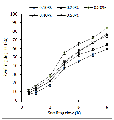The effect of variation chitosan concentration on the swelling degree of CS-g-ALG and ALG–CS mixed beads was studied by varying CS concentration in the range of (0.1-0.5%) in the feed mixture as shown in Fig.3 (a, b). It’s clear from results that the swelling degree was increased with increasing of chitosan concentration up to 0.3%, in which higher equilibrium of swelling degree was observed at 0.3% CS (84%, 72%) for grafted and mixed beads respectively, then tend to decrease with increasing CS concentration beyond 0.3%. Increasing of swelling degree can be explained by the fact that CS is a natural hydrophilic polymer, (i.e. water soluble polymer), where its contain NH2 groups which impart hydrophilicity to the molecule, and so increase affinity of water molecules to penetrate in to the beads and swells the macromolecular chains, thus resulting in a greater swelling of hydrogel. However, at much higher concentration of CS (beyond 0.3%) the density of network chains increases so much that both the diffusion rate of water molecules and relaxation rate of macromolecular chains are reduced. This explains the fall in the swelling degree of hydrogel. Also the use of higher concentrations of CS lead to increase the viscosity of mixture, which may create some other complications such as inhomogeneous cross-linking of beads because highly viscous mixture could retard the penetration of water molecules in to the beads. On the other hand; minimum concentrations less than 0.3% lead to decreasing in the swelling degree, which can be explained as the amount of CS will be not enough to form the gel network with activated alginate backbone due to that the number of hydrophilic CS chains will be decrease and more shorter, leading to that the swelling degree will decrease. Also it was observed from results that the swelling degree of grafted beads (fig. 3a) was higher more than mixed beads (fig. 3b), this indicate that the grafting process was enhanced the swelling process of hydrogel. Finally from the results it was clear that the equilibrium swelling degree of mixed hydrogel was obtained after 6h of swelling (72%), while in case of grafted beads, the beads need more than 6hr to reach its equilibrium swelling degree. These observations may be attributed to that in chemically cross linked hydrogels (CS-g-ALG), polymer chains are connected by covalent bonds through PBQ molecules which working as spacer increases the pores volume in the network structure, thus it need more time to reach the equilibrium swelling. Polymer chains of physical gels (ALG–CS mixed hydrogel) are connected through non covalent bonds such as van der Waals interactions, ionic interactions, hydrogen bonding, or hydrophobic interactions [26]. The absence of spacers between COO-groups of alginate and NH3+groups of chitosan make the formed polyelectrolyte network more compact with less pores volume. This leads directly to absorb less amount of water. Physical forms represent secondary valence networks while the covalent form indicates primary valence networks [27].