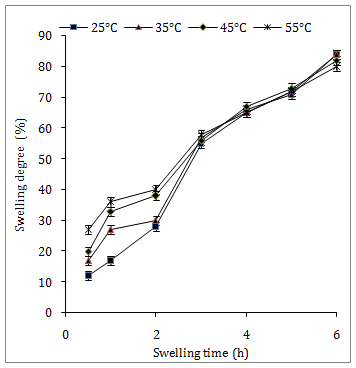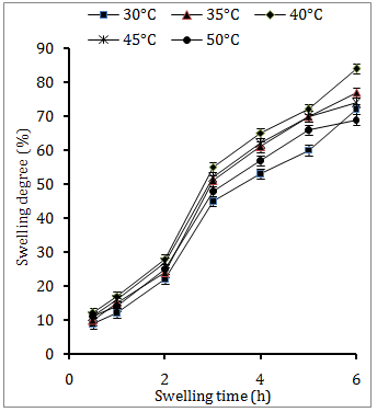 It was clear from results as shown in fig. 9 (a, b) that the swelling degree of both grafted and mixed beads were increased gradually at the first two hours of swelling with increasing temperature of the cross-linking solution. Beyond 2h of swelling; there is no difference of swelling degree values at all different cross-linking temperatures. These observations may be attributed to that increasing temperature of cross-linking accelerate the diffusion of water molecules to network of beads at the initial swelling time (2h), also increases the diffusion of Ca2+from outside into the core of the gelled bead, resulting an increasing in the swelling degree. After 2h of swelling, all beads which prepared at different cross-linking temperatures took the same temperature of the swelling medium (37 °C), and this explains the constancy values of the swelling degree at different cross-linking temperatures. However, at high temperature beyond the studied range (beyond 55 °C) the beads start to loss its mechanical properties and collapsed completely.