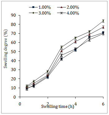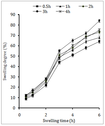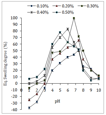 a-Swelling studies were conducted using wet beads; the term wet refers to the state of the beads immediately after the preparation. In a typical swelling experiment, a pre weighed amount of grafted and mixed hydrogel wet beads (1g) were immersed in an aqueous reservoir (swelling medium temperature 37 oC) using buffer saline with pH range from (1.0-10) and allowed to swell for a definite time period (0.5-6h). Buffer salines, which readily provide different pH values, were prepared freshly from solutions of citric acid, disodium hydrogen phosphate, sodium di hydrogen phosphate, hydrochloric acid and potassium chloride, the strength of ion was adjusted by NaCl. The swollen beads were taken out at predetermined time pressed gently in between two filter papers to remove moisture adhering to the surface, immediately followed by weighing on an electronic balance.