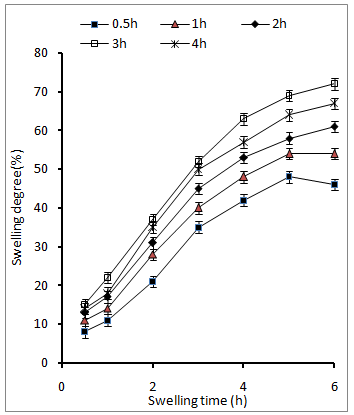 The effect of variation the reaction time on the swelling degree of CS-g-ALG and ALG–CS mixed beads was studied in the range (0.5-4 h) as shown in Fig.5 (a, b). It was clear from results that the swelling degree was increased gradually with increasing reaction time up to 3h, while it slightly decreased beyond that time. These results can be attributed to that with increasing grafting time (in case of grafted beads) up to 3h, the formed network structure also increased. Thus, void volume increased and the swelling degree increased consequently. The same explanation can be used in case of ALG-CS mixed beads. Over 3 h of reaction time, no functional groups, COO-and NH3+, were left free. So, prolongation of reaction time has almost no effect.