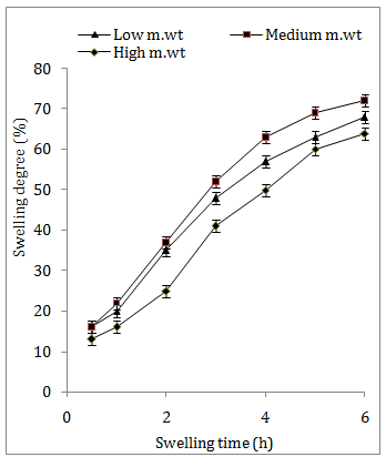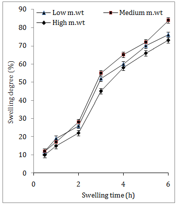 The effect of variation the molecular weight of chitosan (low, medium and high) on the swelling degree of grafted and mixed beads was studied as shown in fig. 6 (a, b). From results, it was observed that the swelling degree increased with increasing chitosan molecular weight of from low to medium and then decreased with high molecular weight of chitosan. This may be attributed to that with increasing molecular weight (from medium to high) the viscosity of the mixture will increase rapidly, then the movement of chains will be very slow and the crosslink density also increase. This leads to reducing the penetration of water molecules into the gel network. On the other hand, at low and medium chitosan molecular weights the swelling degree will increase where the viscosity of the solution will decreased and the gel network will be more flexible. This obviously leads to increasing number of hydrophilic groups, thus increases affinity of water molecules to penetrate in to the beads and swells the macromolecular chains resulting an increasing in the swelling degree.