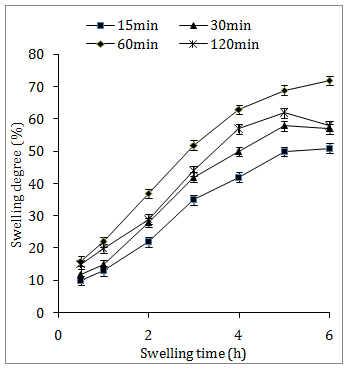 The effect of variation the cross-linking time in CaCl2 solution on the swelling degree of both grafted and mixed beads was studied in the range (15-120 min) as shown in fig. 8 (a, b). It was clear from results that the swelling degree increased with increasing of cross-linking time up to 60 min, and then it's slightly decreased with further increasing of time. These observations may be attributed to that increasing time of cross-linking increase the homogeneity of beads and formation of more network structure and this obviously leads to increase the degree of swelling. While the slightly decreasing of swelling degree beyond 60 min of cross-linking may be attributed to that the beads be more tight and hardness, which may be hinder the penetration of water molecules in to the beads and this obviously leads to decreasing degree of the swelling