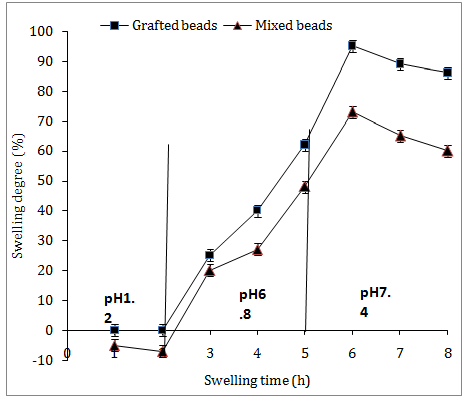 It was clear that the beads did not have any swelling occurs in first 2 h in simulating gastric fluid [SGF pH1.2] when they are transferred into simulating intestinal fluid [SIF pH 6.8], the equilibrium swelling degree increased to 62%, 48% for grafted and mixed beads respectively after 3h from transferring, and reached the maximum value at the first hour (95%, 73% respectively) from transferring into simulating colonic fluid [SCF pH 7.4], and eventually beads tend to shrink with increasing time of swelling up to 3h in pH 7.4 after transferring it into simulating colonic fluid [SCF pH 7.4].