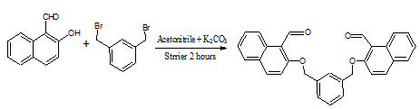 To a solution of (1g, 5 mmol) of 2-hydroxy-1-napthaldehyde in 15 mL of acetonitrile was added (0.345g, 2.5 mmol) of K2CO3 and the resulting solution was stirrer for 30 min under thermostat condition at 60 °C wherein a bright yellow color solution was obtained. To this stirring solution was added a solution of (0.66g, 2.5 mmol) of α,α’-dibromo-m-xylene in 5 ml of acetonitrile in one lot. The resulting pale yellow solution was stirred until the solution decolorized and on addition of 20 ml of cold water it yielded a spongy white dialdehyde product. The spongy product was filtered using sintered crucible. Yield is 71%, m. pt 164 °C. Anal. Cal. (C30H24O4), C(33.37), H(5.05), N(5.40), O(56.08) Found: C(33.31), H(5.02), N(5.37), O(56.04). IR (KBr Pellets) (C=O) 1665 cm-1, (C=C)aro 1581 cm-1, (C-O) 1235 cm-1. The synthesis of the dialdehyde is depicted in Scheme.1.