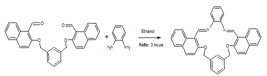 To a ethanolic solution of (1g, 0.4 mmol) of the dialdyhyde in 10 ml of ethanol was added a solution 1,2-diamino benzene (0.8g, 0.4 mmol) in 10 ml of ethanol solution under gradual addition in drops using a dropping funnel over 30 min. The resulting pale yellow turbid solution was refluxed for 4h wherein a clear bright yellow solution was obtained, on standing the solution to room temperature a bright yellow colored product separated out. Yield: 89% m. pt: 178 °C. Anal. Cal. (C36H26N2O2), C(83.37), H(5.05), N(5.40), O(6.17). IR (KBr Pellets) (C=N) 1602 cm-1, (C=C)aro 1510 cm-1, (C-O) 1250 cm-1. The synthesis of the overall ligand is depicted in Scheme 2.