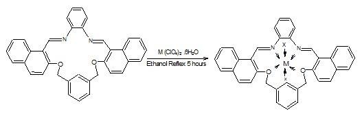 The design and synthesis of macrocyclic complexes [1, 2] initially has lured many a scientist owing to their significance in serving as biological mimics [3-7]. The synthetic macrocyclic complexes mimic some natural accruing macrocyclic complexes [8] resemblance with natural macrocyclic like metalloproteins, porphyrins and cobalamine [9, 10]. The transition metal macrocyclic complexes are active part of metaloenzyme proteins and coenzymes like haemoglophin, myoglobin [11-14]. Lanthanide macrocyclic complexes involving Gd and Eu are extensively used as NMR shift reagents [15]. Identification and realization of the applications of macrocyclic ligands and their transition and inner-transition metal complexes as base transfer catalyst and in biological probe studies [16, 17]have opened up new avenues of exploring their potency in various other fields recently the Napthaldehyde based Schiff bases are gaining significance due to their sequestrating properties towards transition metals [18, 19]. The presence of azomethine group has been reported to possess remarkable antibacterial, antifungal, anticancer and antimalarial activities [20, 21]. In order to understand the involvement of azomethine groups in the above said properties, we have reported the synthesis and spectral characterization of hitherto unreported new 17-membered napthaldehyde based dioxadiazatetra dentate macrocyclic ligand (L), and its Co (III), Ni (II) and Cu (II) perchlorate complexes.