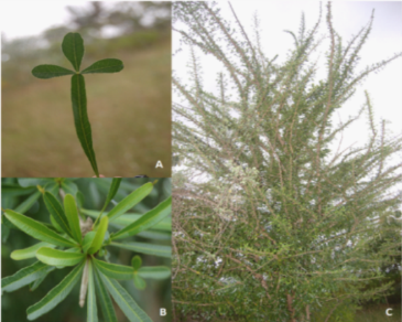 Fig. 1: C. cujete L. A-leaves, B-Branches, C-Wholetree