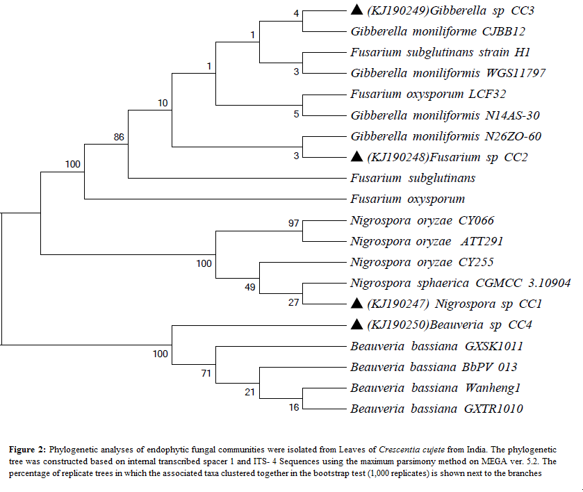 Fig. 2: Phylogenetic analysis of endophytic fungal communities isolated from the leaves of Crescentia cujete from India. The phylogenetic tree was constructed based on ITS-1 and ITS-4 sequences using the maximum parsimony method in MEGA ver. 5.2. The percentage of replicate trees in which the associated taxa clustered together in the bootstrap test (1,000 replicates) is shown next to the branches