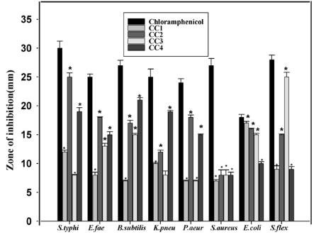 Fig. 3: Antimicrobial activity of fungal extracts of CC1, CC2, CC3 and CC4 was evaluated against gram positive and negative bacteria. *indicates that significantly equal to control, *indicates that significantly not equal. The test was performed in triplicate and the results were given in mean±SD