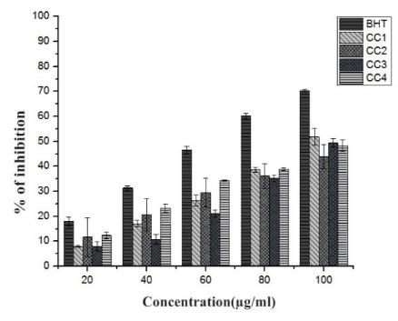 Fig. 4: DPPH scavenging activity of BHT, CC1, CC2, CC3 and CC4. The assay was done in triplicate and the results were given in mean±SD