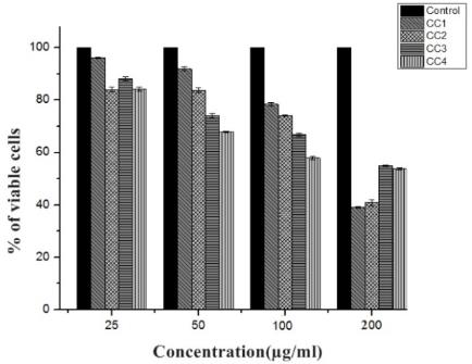Fig.5: MTT assay for EtoAc extract of fungal endophytes of CC1, CC2, CC3 and CC4 against HepG2 cell line for 24h. All the assays were done in triplicate and the results were given in mean±SD.