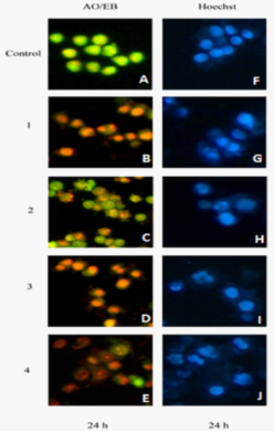 Fig. 6: Results of AO/EB staining. A: Control (Untreated cells), B, C, D and E: treated with ETOAC of isolates CC1, CC2, CC3 and CC4. Results of Hoechst staining: Control (Untreated cells), G, H, I and J: treated with EtoAc extracts of CC1, CC2, CC3 and CC4 strains.