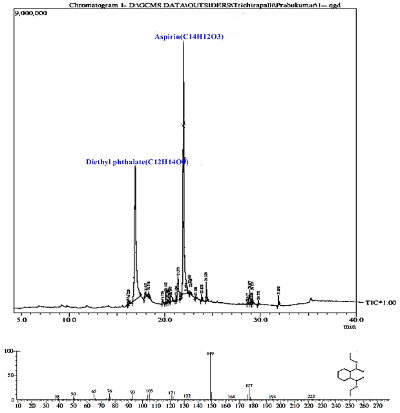 The Gas Chromatography-Mass Spectrometry turns as a basic and important key for metabolic profiling of microbes [34]. In our study, we have identified different bioactive compounds with various pharmaceutical values, such as antibacterial, antioxidant and anticancer activities. It was already demonstrated that the compound diethyl phthalate has antimicrobial, acetylcholinesterase and neurotoxic activity [35]. Phthalates are stated to have antagonism against pathogens and other pharmacological activities. Until now phthalic acid has been known to produce by Gibberella fujikuroi [36]. Raza et al. [37] demonstrated that Benzoic acid, 2-hydroxy-, phenyl-methyl ester (Aspirin) treatment (5-10μmol/ml) induces oxidative stress, cell cycle arrest in the G0/G1 phase, apoptosis and mitochondrial dysfunction against HepG2 cells. Benzyl benzoate is having a good antimicrobial activity [38]. Kotan et al. [39] was proved that the hexane extract of Turkish Achillea, Satureja and Thymus sp. which contains mainly hexacosane and heneicosane and extract has shown potent antibacterial activity over a board spectrum against 25 phytopathogenic bacterial strains. Christinah et al. [40] reported that methanolic extract fraction of Garcinia kola (Heckel) seeds were having potent antibacterial activity mainly due to the presence of 1, 2-Benzenedicarboxylic acid. The derivatives of 1-Phenanthrenecarboxylic acid, 1,2,3,4,4a,4b,5,6,7,8,10,10a-d show antibacterial, cardiovascular and antioxidant activities [41]. Li et al. [42] demonstrated that 2-tert-Butyl-4, 6-bis (3, 5-di-tert-butyl-4-hydroxybenzyl) phenol having the excellent antioxidant activity.