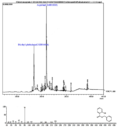 Fig. 7: GC-MS chromatogram results for EtOAc of CC1and MS spectrum for the Benzyl salicylate (Aspirin)