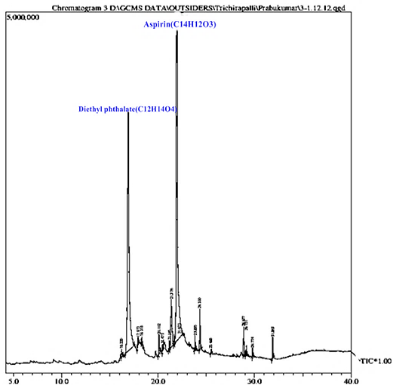GC-MS analysis shows the active ingredients present in the ethyl acetate extracts of all four isolates. The following compounds were identified homogeneously viz: 1,2-Benzenedicarboxylic Acid; Diethyl Ester; Benzyl Benzoate; Benzoic acid, 2-hydroxy-, phenyl methyl ester; Dodecanoic acid, 1, 2, 3-propanetriyl ester; Tetratetracontane; Heneicosane; Hexacosane; 1,2-Benzenedicarboxylic Acid; (-)-Isolongifolol; n-Hexadecanoic acid; Hexatriacontane; 1,6-methanonaphthalen-1(2h)-ol, octahydro-; 1-Phenanthrene carboxylic acid, 1,2,3,4,4a,4b,5,6,7,8,10,10a-d; Benzoic acid, 2-hydroxy-, phenyl methyl ester; 9-Octadecenoic Acid (Z)-; Octadecanoic acid; Tetracosane; Tetratetracontane; Squalene; 1-Tetradecanol, acrylate; 1-Stearoyl-1h-Imidazole; 2-tert-Butyl-4,6-bis(3,5-di-tert-butyl-4-hydroxybenzyl)phenol (fig. 7, 8, 9 and 10).