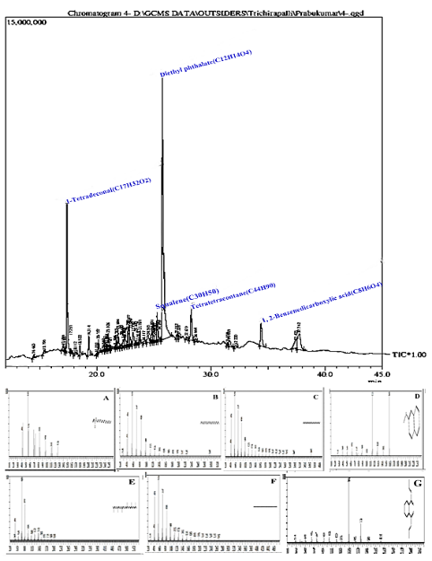 Fig. 10: GC-MS chromatogram results for EtoAc of CC4 and MS spectrum for A: 1-Tetradecanol, B: Heneicosane, C: Hexacosane, D: 2-methoxynaphthalene, E: Squalene, F: Tetratetracontane, G: 1, 2-Benzenedicarboxylic Acid