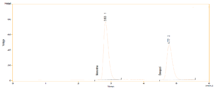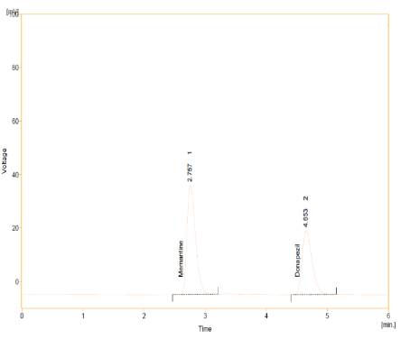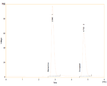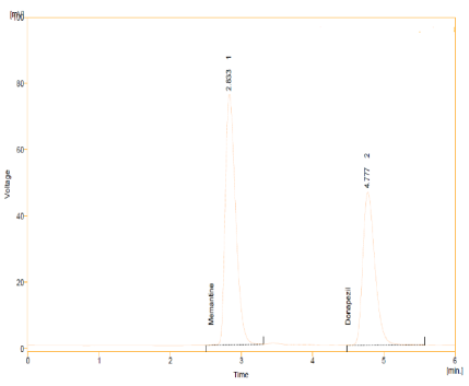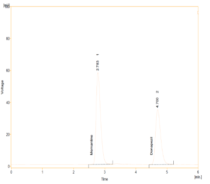 Method development for Memantine HCl & Donepezil HCl was started with the development of chromatograms using neat solvents and combinations of Methanol, Sodium dihydrogen phosphate, Acetonitrile in different ratios. Sodium dihydrogen phosphate: Acetonitrile in the ratio of (30:70 v/v) was selected as the mobile phase for Memantine HCl & Donepezil HCl, which resulted in acceptable peak parameters. The retention time of Memantine HCl and Donepezil HCl was found to be 2.833 min. and 4.777 min respectively.
