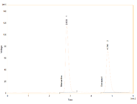 To carry out the assay of the method, %purity was calculated. 5 injections of standard and sample (formulation) having 100% concentration (80µg/ml of Memantine HCl and 40µg/ml of Donepezil HCl) of drugs were injected simultaneously and the peak area were recorded.