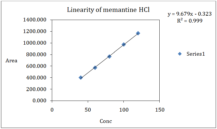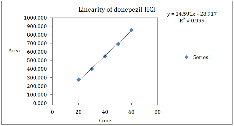 Appropriate volumes were injected from standard stock solution containing 40-120 mg/ml of Memantine HCl and 20-60μg/ml of Donepezil HCl respectively. Each standard was analyzed in five replicates, and peak area was noted. The relationship between peak area and concentration was established by the simple regression equation method.